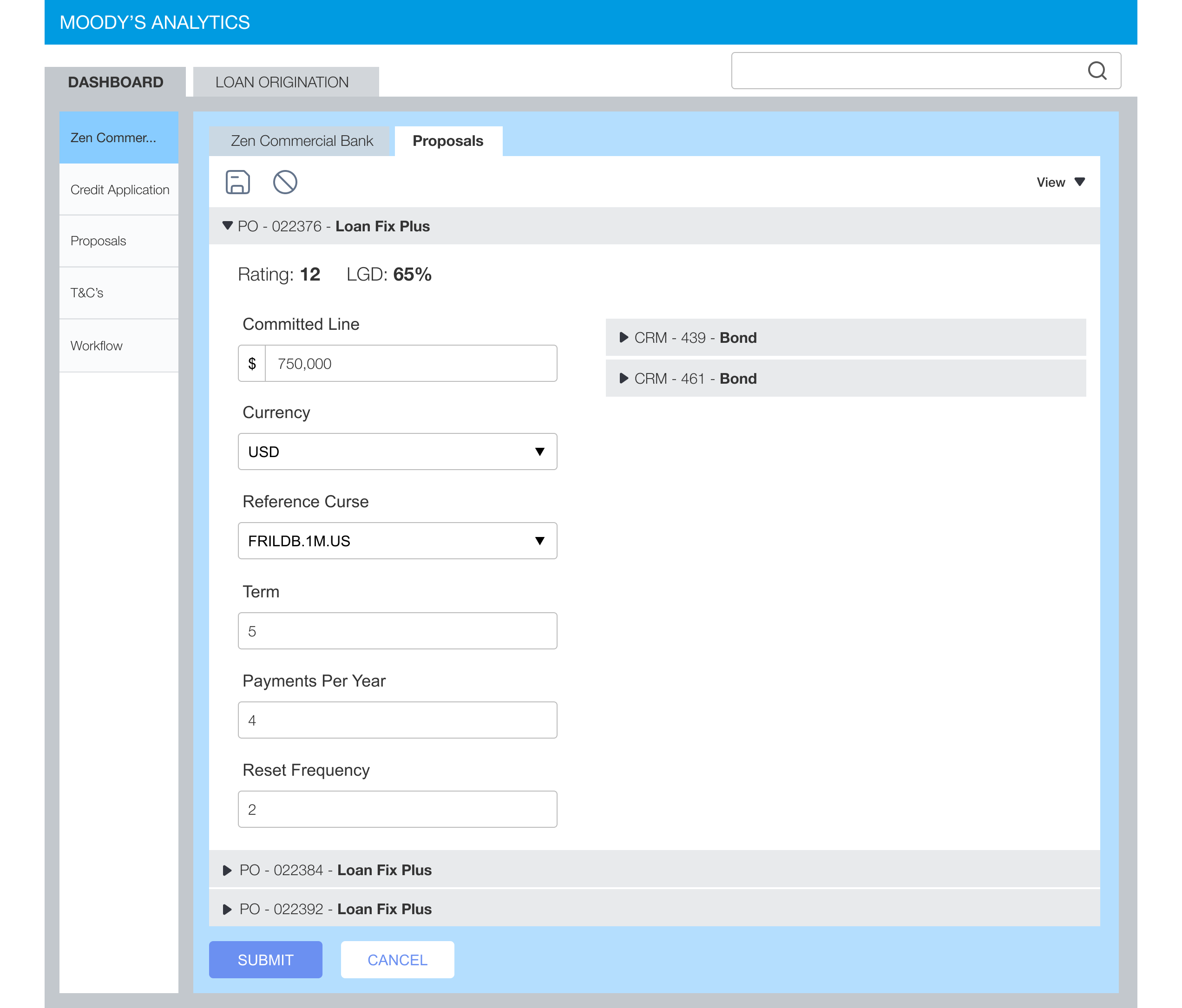 Moody’s Analytics offers unique applications for financial risk management organizations. Moody's developed a Loan Origination application that helps commercial banks determine risk in providing loans. I led all user experience design efforts in developing this application. Our team researched and summarized industry data. We interviewed clients to deeply understand user needs and wants. We established design principles with our tech development team. UX outputs included personas, customer journeys, user flows, wireframes, and a visual design system. In 16 weeks (8 iterations) of development our team launched a beta version of the application. Our main client tested and provided feedback for our team to make improvements for a quick launch of the application 6 weeks after the beta release.