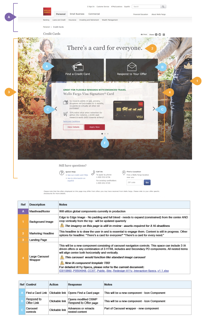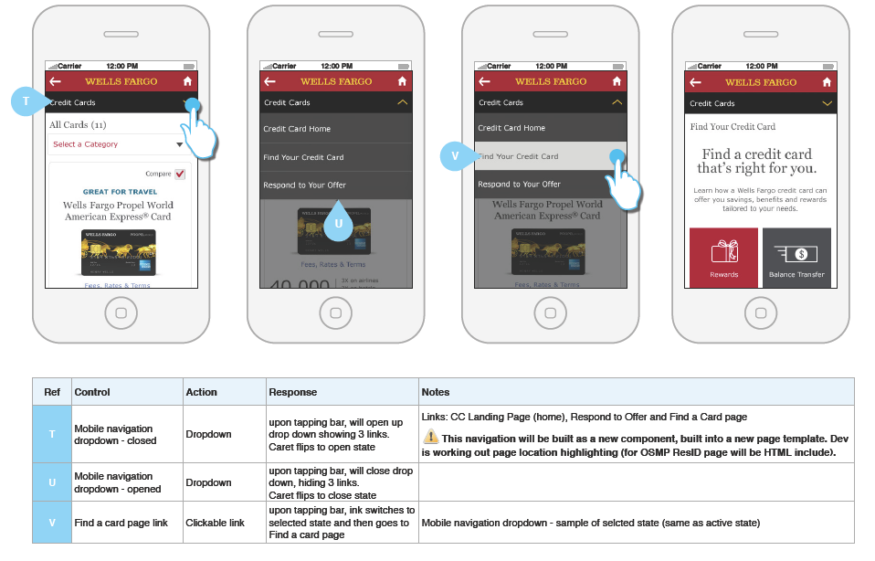 Wells Fargo is redesigning several of their product websites by improving existing user flows and transforming sites to be responsive. I led a UX team that redesigned the credit cards website. The team consisted of a content writer, visual designer and I was the interaction designer. Below are samples of the design work including visuals with wireframe annotations and userflows. We took a mobile first approach to all design efforts.