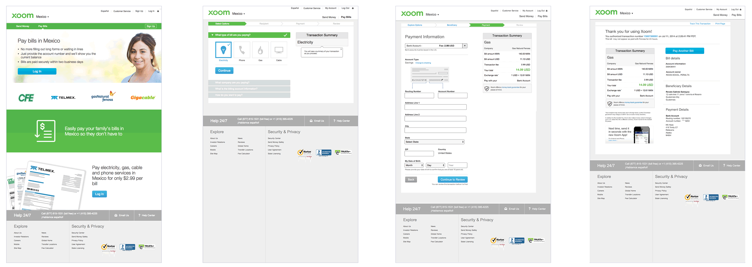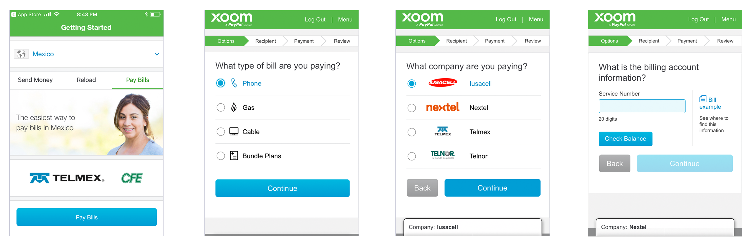 Xoom is an online money transfer service that offers a way to send money to friends and family who live outside the United States. Xoom expanded their services and developed a new product where users could also pay bills for their friends and family. On this initiative, I was the UX lead managing all design efforts.